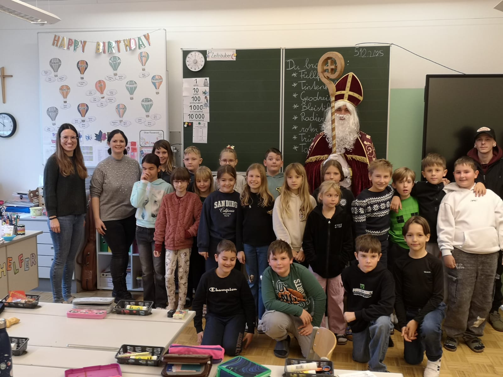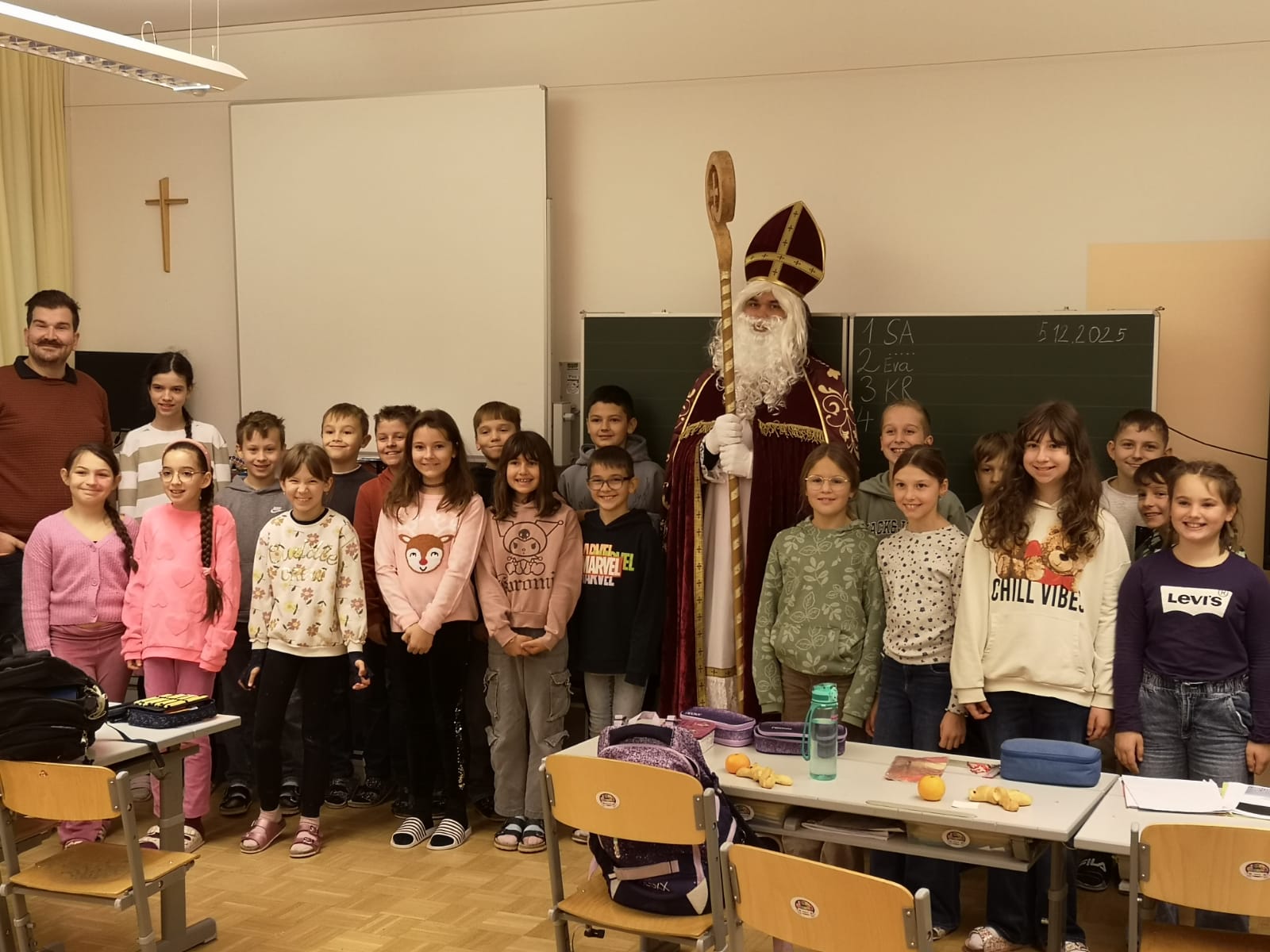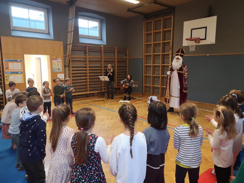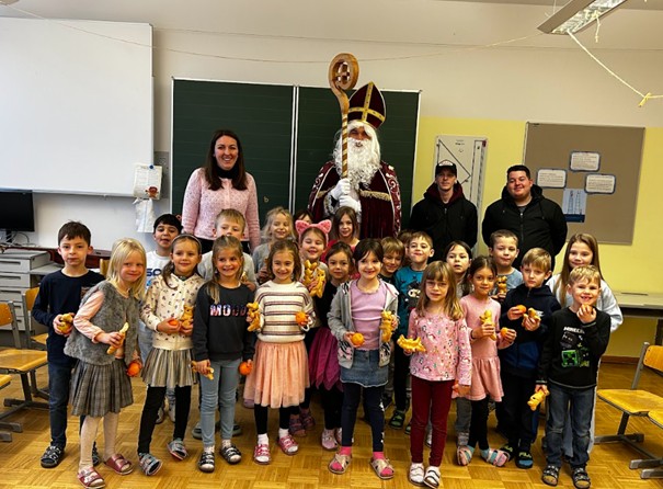 Am 05. Dezember durften wir an unserer Schule einen ganz besonderen Gast willkommen heißen: den Nikolaus! Unsere 1. Klassen hatten sich schon im Vorfeld mit viel Fleiß auf diesen Moment vorbereitet und überraschten den Nikolaus mit einem fröhlichen Lied und einem stimmungsvollen Gedicht. Große Augen, strahlende Gesichter und gespannte Vorfreude – der Zauber des Nikolaustages war deutlich spürbar. Nach einem kurzen Gespräch mit den Kindern verteilte der Nikolaus an alle Schülerinnen und Schüler eine kleine Überraschung: einen köstlichen Germteigkrampus und eine saftige Mandarine. Ein herzliches Dankeschön an den Elternverein für die Vorbereitung – und natürlich an den Nikolaus selbst für seinen Besuch!